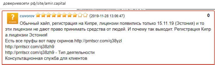 По мнению пользователя сети, хайп Amir Capital зарегистрирован на Кипре, а лицензия появилась только в конце 2019 года и то от регулятора Эстонии. Данное разрешении дает право только принимать средства от людей, поэтому о выводе денег, даже на законодательном уровне нет никакого упоминания.