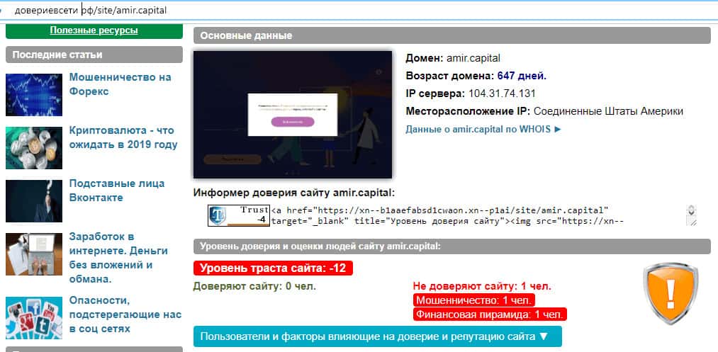 Мошенническая контора Амир Капитал использует свой ресурс чуть больше года, но никак это не инвестиционная компания с многолетним опытом работы. К тому же уровень траста на данный момент составляет значение -12, и не доверяют сайту из-за подозрениях в мошенничестве и финансовой пирамиде.