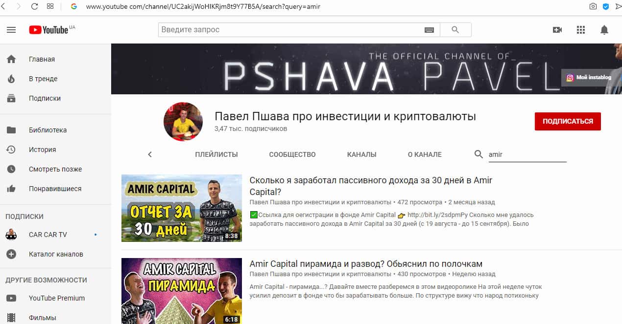 Аферисты Амир Капитал скорее всего запустили свой проект под названием Pshava Pavel, который в ютуб, в качестве блогера занимается инвестированием и он такой успешный, что кажется что все дураки, а один он умный. Таким образом, он зарабатывает на партнерке по привлечению новых лохов.