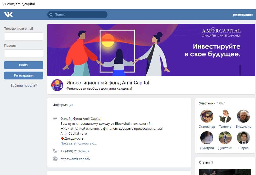Мошенническая контора Amir Capital постоянно поддерживает поток новых жертв в свой лохотрон, поэтому для этого им нужна обширная деятельность в социальных сетях. Там идет первичная обработка будущей жертвы. Если вы не хотите попасться в их лапы, то предоставляем ознакомиться с их группами в соцсетях: