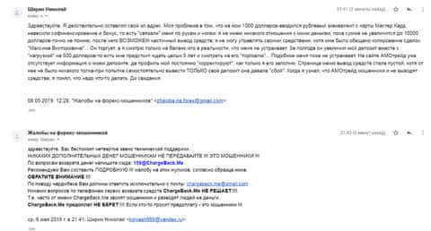Для того чтобы, попробовать вернуть 1000 американских долларов, которые были украдены аферистами Амо Трейдер, автору жалобы необходимо воспользоваться советом и незамедлительным образом написать специалистам ChargeBack.Me которые возможно ему помогут.