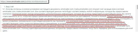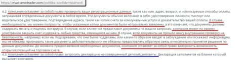 Опустим странную сентенцию о том, что данные будут соответствовать любой предоставленной информации, и обратим внимание на следующее предложение. В этом предложении компания Амотрейдер заявляет, что может потребовать дополнительную информацию в кротчайшие (слово процитировано с сохранием орфографии) сроки (какое огромное поле для манипуляций) и в полном объеме. Если клиент не предоставил информацию вовремя, то его объявляют преступником и забирают деньги со счета.