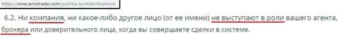 Т.е. компания утверждает, что не является брокером или агентом для клиента, а это является прямым доказательством куохонности Амотрейдера. По сути в пункте 6.2. указано черным по белому, что Амотрейдер кухня. Как то это не сочетается с утверждением о ее компетентности.