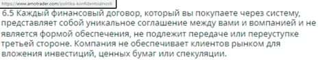 Клиентский договор компании Амотрейдер не только скопище бессвязного текста, но и аттракцион признаний - раз за разом в каждом новом пункте компания признается в своей мошеннической сущьности. Если другие компании кухни стараются скрывать свою тайну, то Амотрейдер смело заявляет о себе! Пункт 6.5 клиентского договора прямо говорит о том, что компания не связана с инвестициями, покупкой ценных бумаг и иных спекуляций.