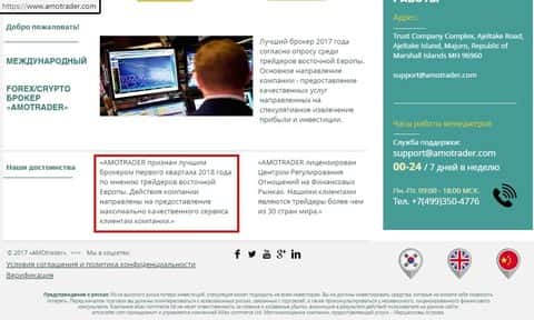 Итак, декабрь 2017 - день рождения сайта компании. И вдруг, внезапно, спустя три месяца компания Амотрейдер становится лучшим брокером 1-го квартала 2018 года! По версии тредеров восточной европы. Вдумайтесь: трейдеры восточной европы (что это за экспертное сообщество такое?) за три месяца настолько прониклись к компании, что признали ее лучшим брокером первого квартала! Так написано на самом сайте компании.