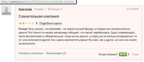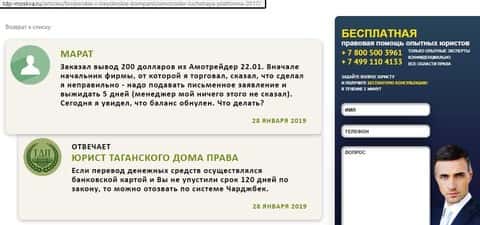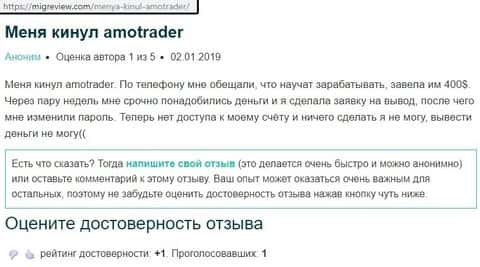 Компания Амотрейдер настолько успешна, что клиенты компании оставляют отзывы не на специализированных досках/порталах/сервисах отзывов, а на порталах юридической поддержки граждан. В частности, Марат лишился денег по стандартной схеме - подал заявление, пока решел бюрократические вопросы счет был обнулен.