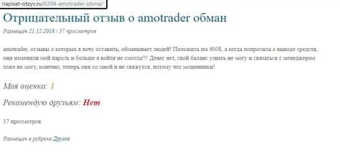 AMOtrader - это свежая, не так давно объявившаяся кухня, целью которой выманивать деньги из невнимательных или доверчивых людей. Пополнение депозита в компании это очередной изощренный способ избавиться от своих денег. Попав в лапы мошенников Амо Трейдера, деньги будет невозможно выцарапать обратно, как невозможно будет и получить прибыль, торгуя у них. Избегайте любых финансовых отношений с комапнией AMOtrader!!!