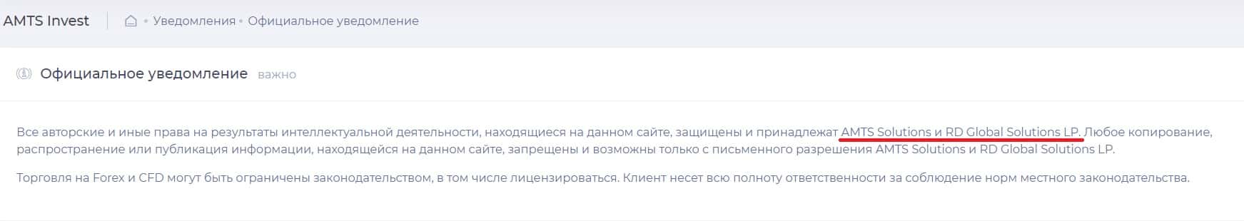 На сайте AMTSInvest имеется информация, что от имени бренда действуют компании AMTS Solutions и RD Global Solutions LP. Но о них ничего не известно.