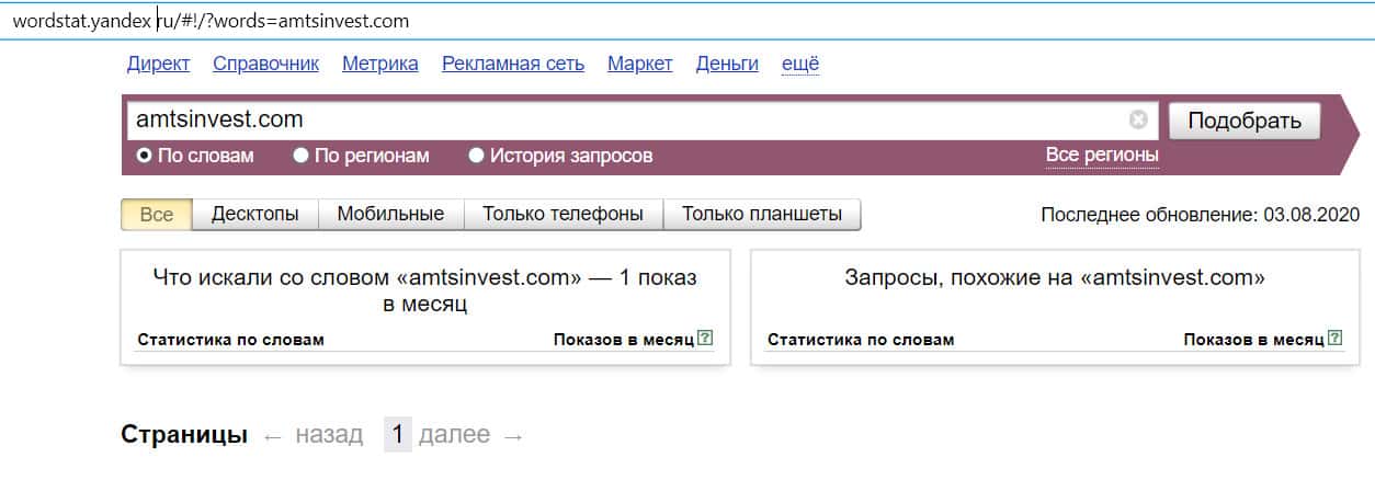 Количество запросов в поисковике Яндекс по доменному имени "amtsinvest com" без точки, не отличается от предыдущего. Результат: 1 показ.