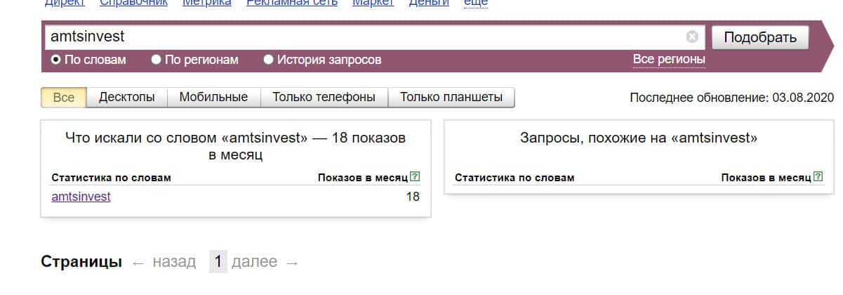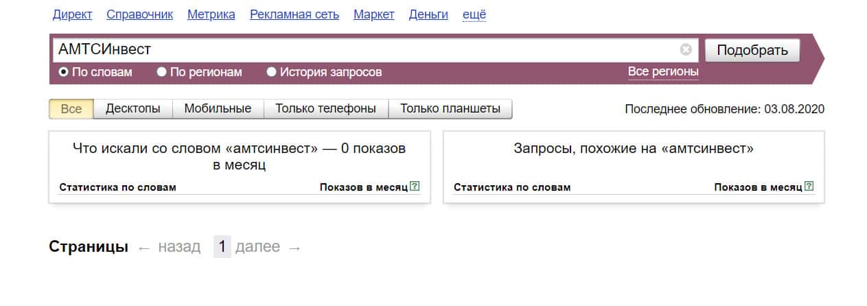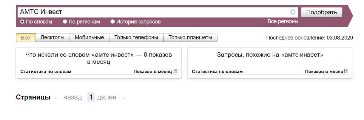 Посмотрим, сколько раз люди искали название бренда "АМТС Инвест" на русском языке с пробелом: результат 0 показов.