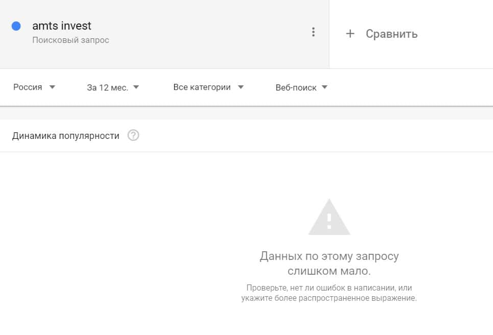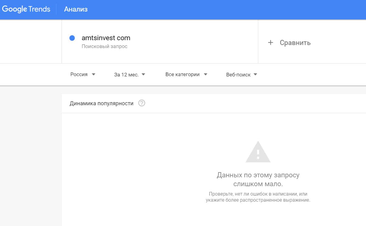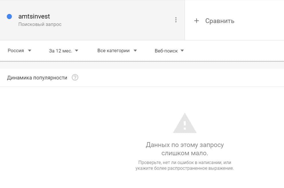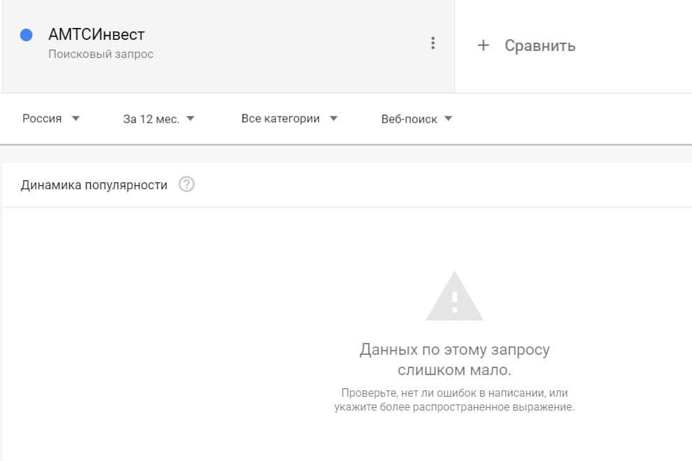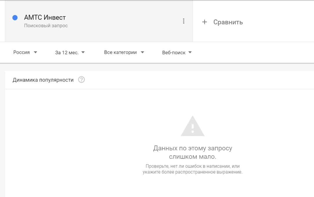 Посмотрим, насколько популярно название бренда "amtsinvest", написанное на английском языке. Данных по этому запросу нет, так как никто не искал этот бренд в Гугл.
