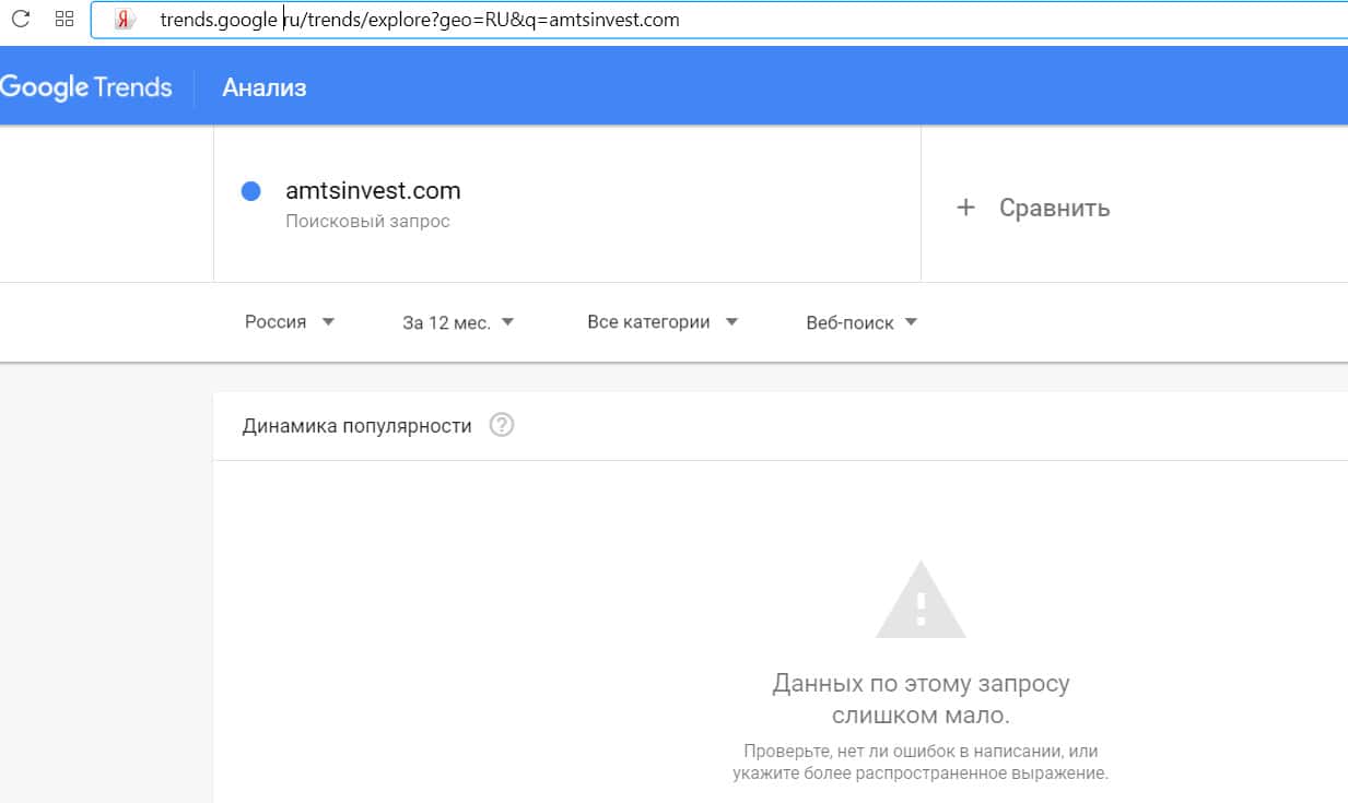 Доменное имя мошеннического сайта "amtsinvest.com" вбивали в поисковую систему Гугл слишком редко, поэтому данных по этому запросу практически нет.