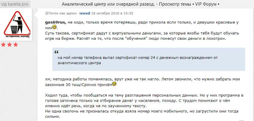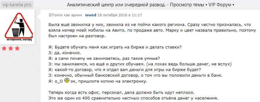 Некоторым опытным пользователям форума vip karelia pro также удалось записать звонок одного из шулеров Аналитический центр Аддингтон брейкер. Они пытаются заманивать к себе лохов бесплатным обучением и перспективами, которые в итоге оборачиваются потерей всех вложенных средств.