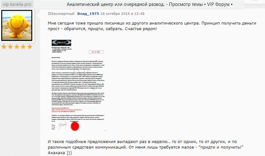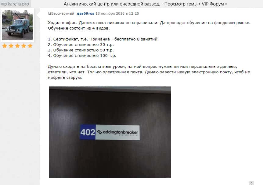 Одним из правдивых источников информации о шарашке Аналитический центр Аддингтон брейкер стал онлайн-форум vip karelia pro, где жители Карелии, собственно, где и находится офис шарашки AC Addington делятся своим мнением о данных мошенниках и предостерегают других пользователей ни в коем случае не связываться с ними.