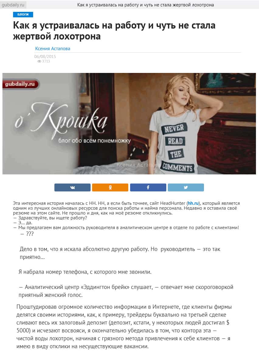 Распространённой стратегией у мошенников AC Addington является нахождение лохов посредством фейкового приглашения на работу. Это и произошло с девушкой, написавшей приведённый ниже отзыв-статью. Приглашения на работу – лишь прикрытие, на деле AC Addington нуждается лишь в ваших деньгах.