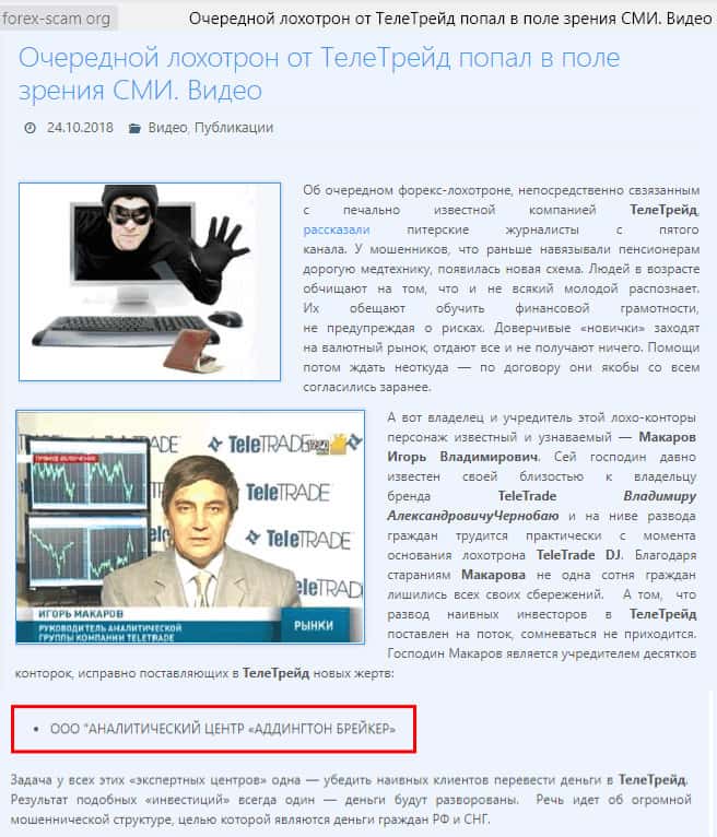 Мошенники Аналитический центр Аддингтон брейкер под эгидой ТелеТрейд нашли способ обворовывать честных людей, и при этом выходить сухими из воды. Мошенники пользуются безразличием к своим гражданам, и лишают всех сбережений среди белого дня и абсолютно хладнокровно.
