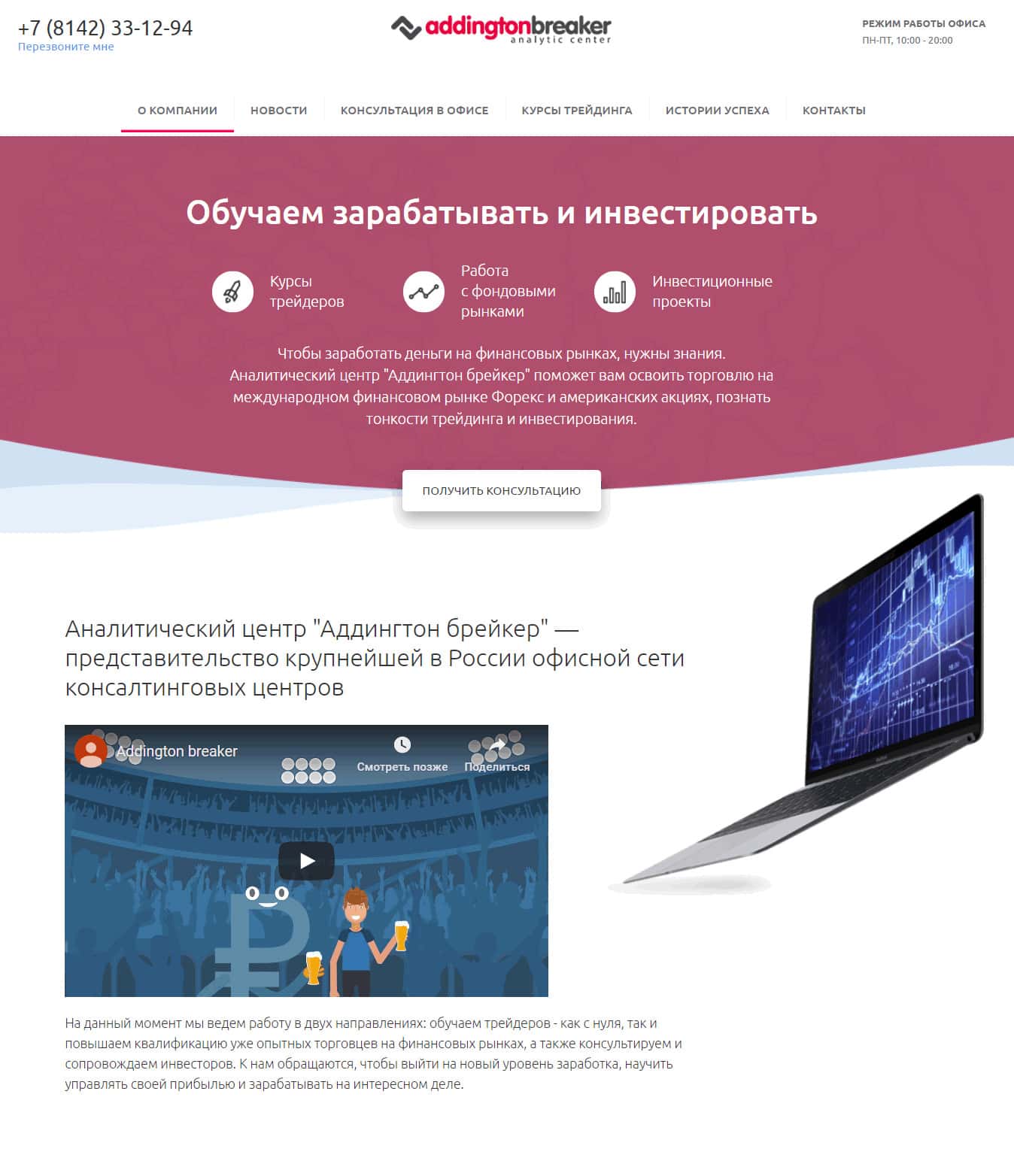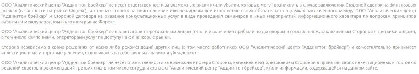 Как не сложно догадаться, мошенники AC Addington, помимо обзвонов клиентов своими верными трейдинговыми псами, используют также Интернет-портал, на котором размещают лживую информацию о компании. Начнём с того, что Аналитический центр Аддингтон брейкер на деле не обучает пользователей трейдингу.