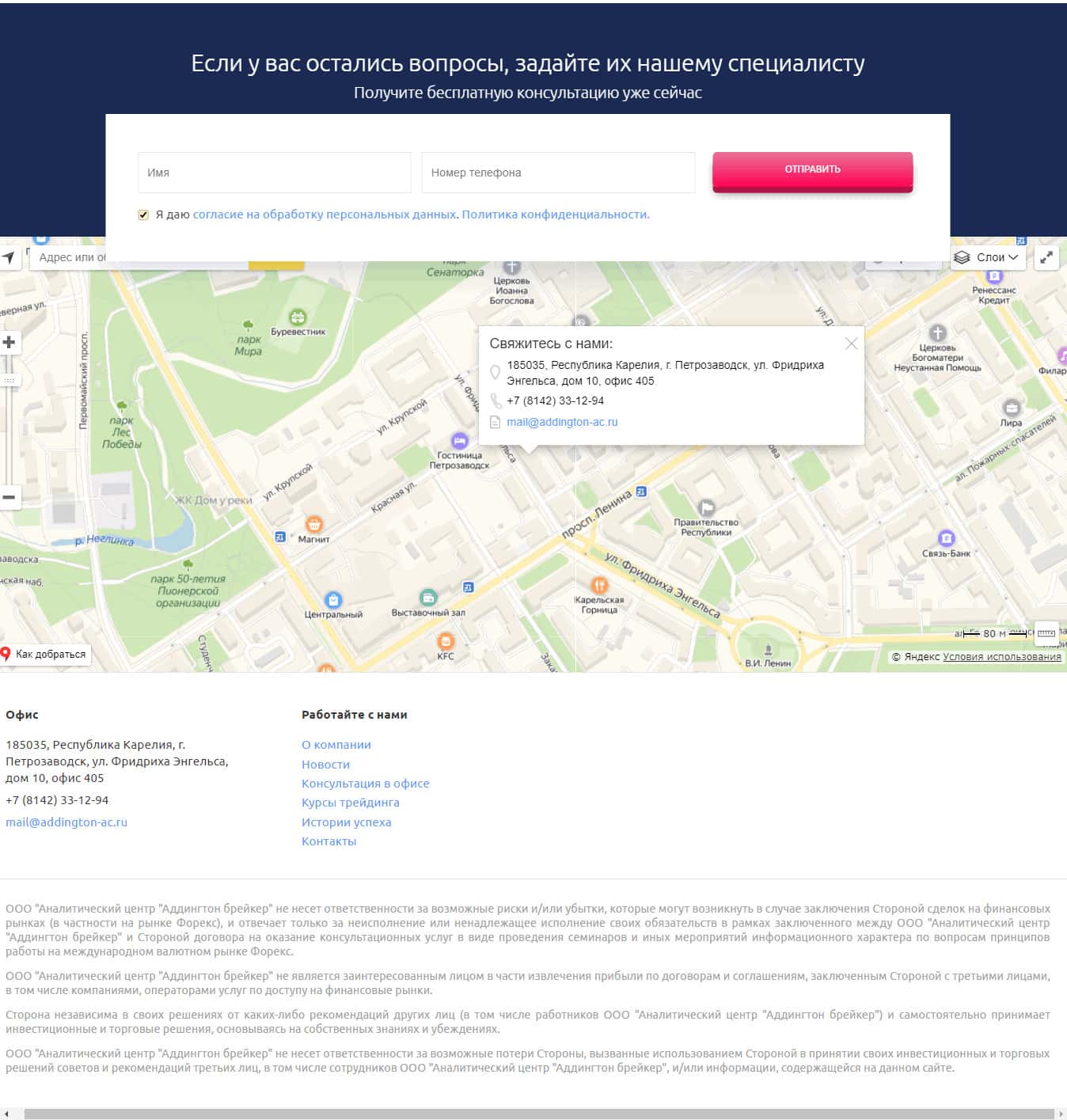 Как уже было сказано, местом сборища всех работничков шарашки Аналитический центр Аддингтон брейкер является некий офис в республике Карелия. В этом же самом офисе улыбчивые дамочки и наглые звонари осуществляют безнаказанное разводилово людей на их честно заработанные деньги. Контакты шулеров представлены ниже: