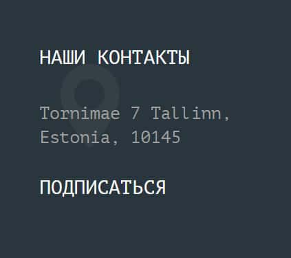 Главный офис мошеннической фирмы находится по адресу: Tornimae 7 Tallinn, Estonia, 10145. Но исходя из информации полученной из интернета, то создаётся впечатление, что нет никакого офиса, жулики просто указали первый попавшийся адрес в Эстонии и всё, что бы было что указать на сайте.