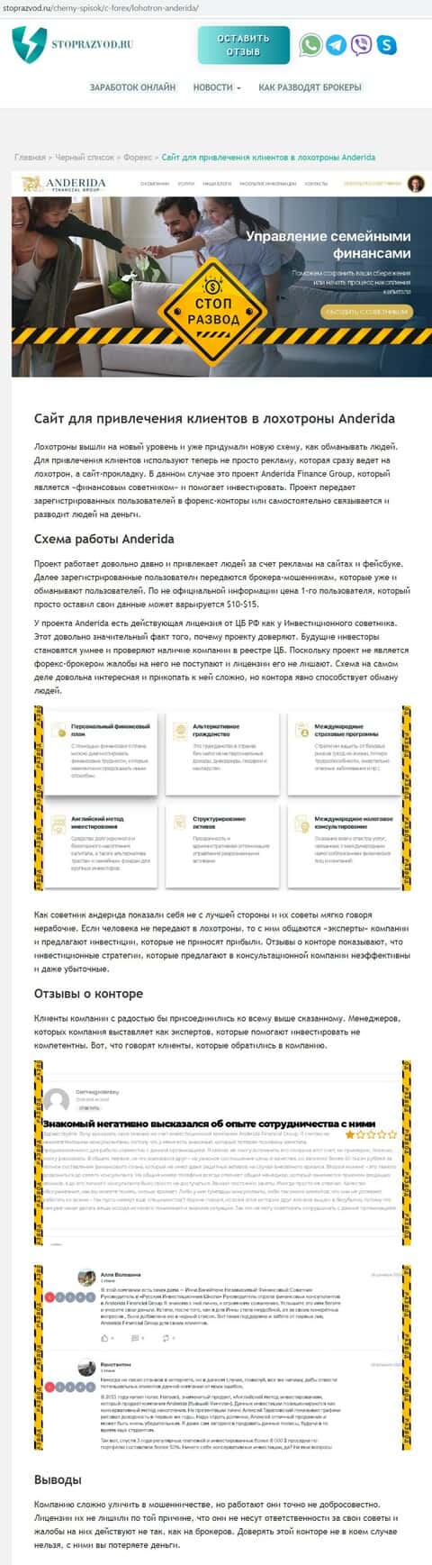 Далее предлагаем увидеть информационный материал про аферистов AnderidaGroup, созданный авторами сайта-разоблачителя stoprazvod ru.