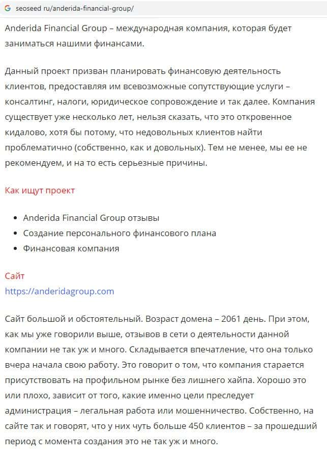 - Что можно сказать о главной странице сайта мошенников anderidagroup com?