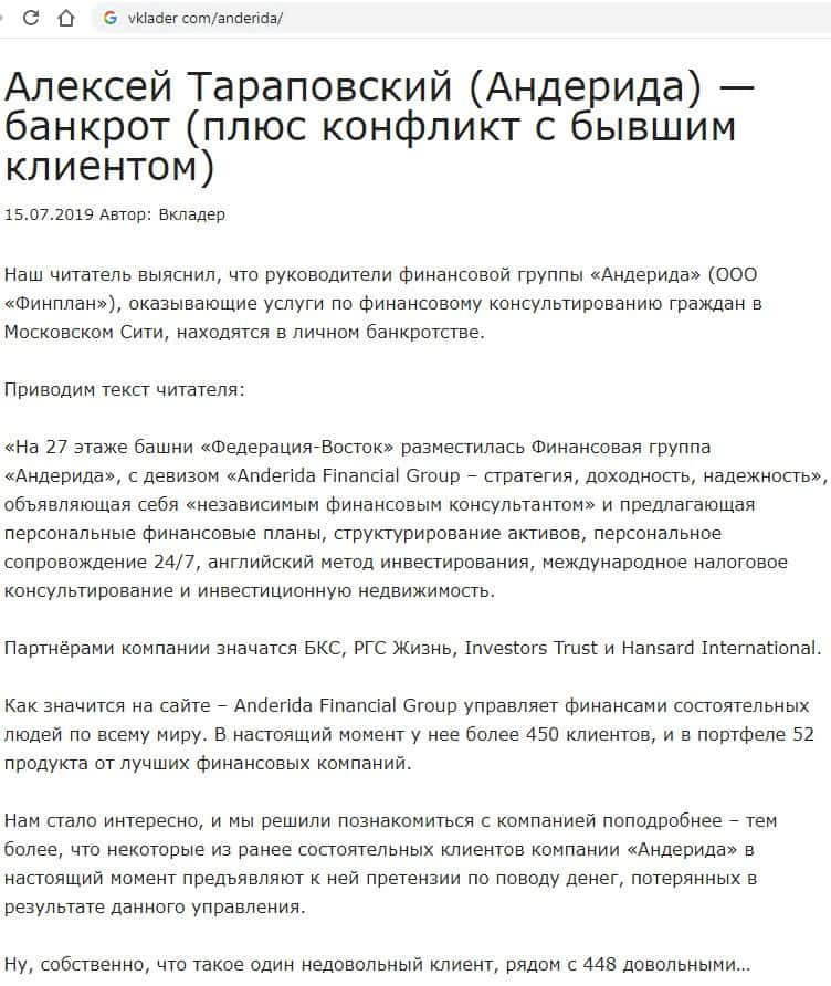 Третий авторитетный ресурс указывает на то, что руководитель инвестиционной компании Андерида Алексей Тараповский является банкротом.