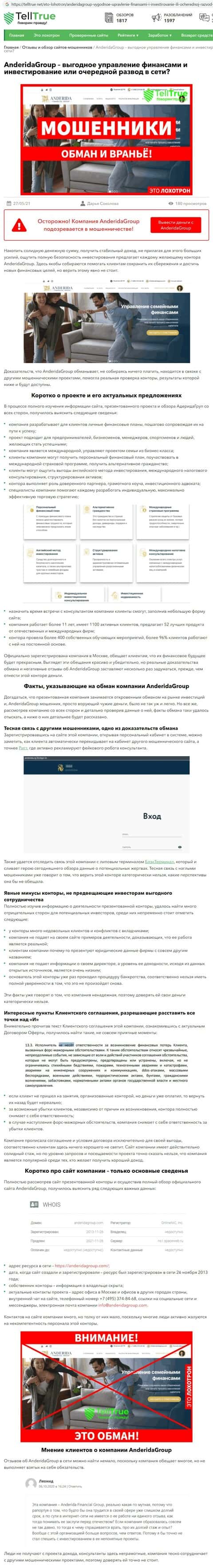 Своё мнение о конторе AnderidaGroup опубликовал сайт telltrue net. Веб-сервис считает данную организацию самым настоящим мошенником, который отбирает денежные средства у своих клиентов.