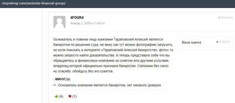Очередной пользователь сети рассказал, что основателем конторы Андерида выступает некий мошенник, который стал банкротом, поэтому доверять туда деньги вообще нельзя.