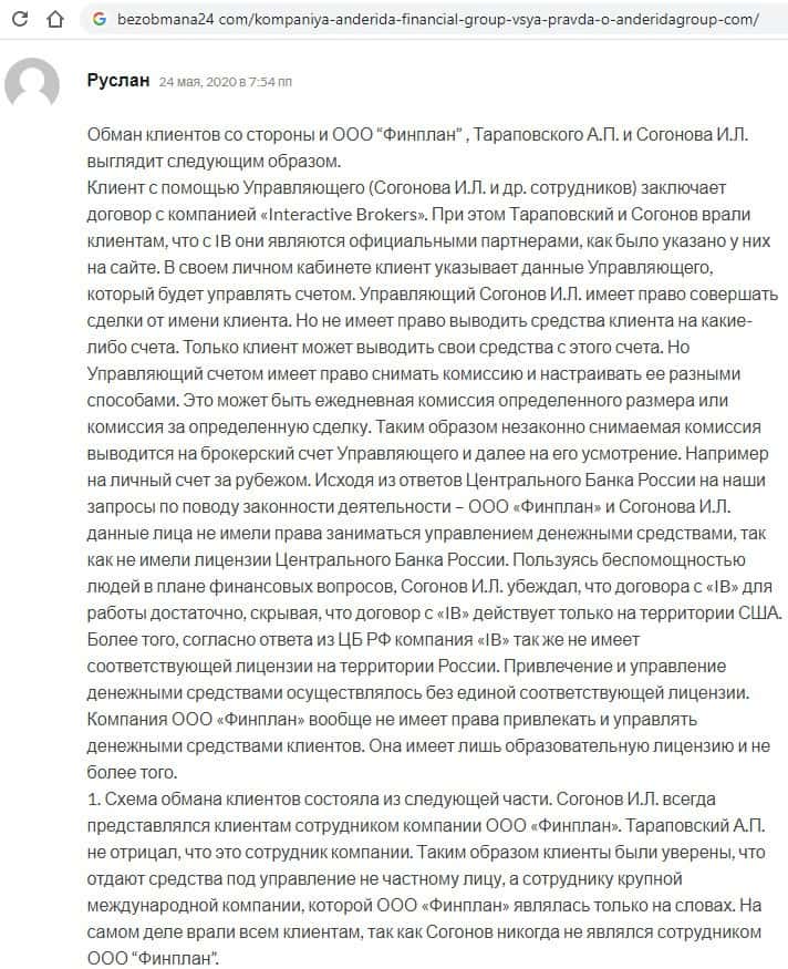Официальным юридическим лицом, которое ведет дела от имени мошенников Андерида является ООО "Финплан".