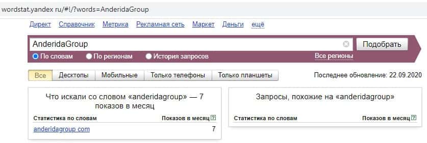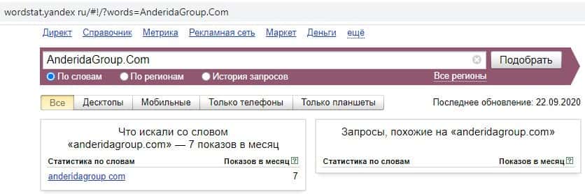 Начинаем с запросов на английском языке. Первый запрос на английском языке в яндексе без пробела "AnderidaGroup" выдает результат в 7 показов в месяц.
