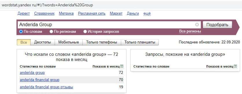 Второй запрос в Яндекс на английском языке с пробелом "Anderida Group" выдает результат в 72 показа в месяц. Это существенно больше, чем в предыдущем случае.