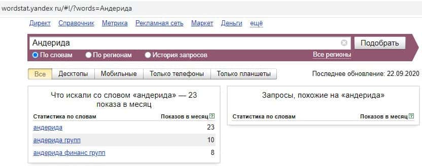 - Какое количество запросов по конторе Андерида показывает Яндекс?