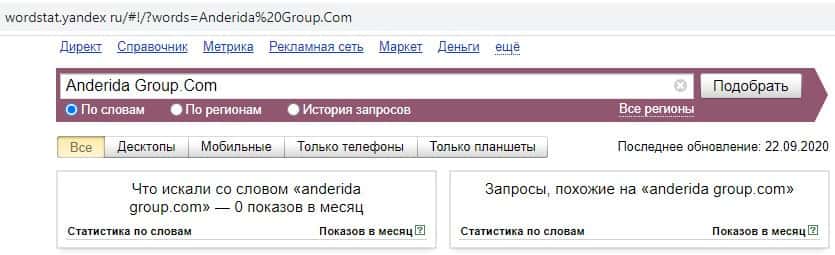 Третий запрос в яндексе на английском языке с двумя пробелами "Anderida Group Com" выдает уже результат в 0 показов в месяц. Это намного меньше, чем в предыдущих случаях.