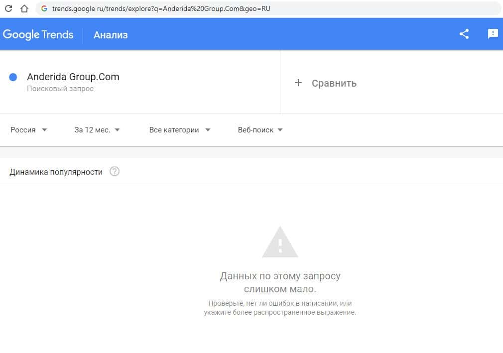 Такой же запрос в Гугл на английском языке только без пробела и с точкой "AnderidaGroup.Com" выдает результат в 0 показов в месяц, как и в других случаях.