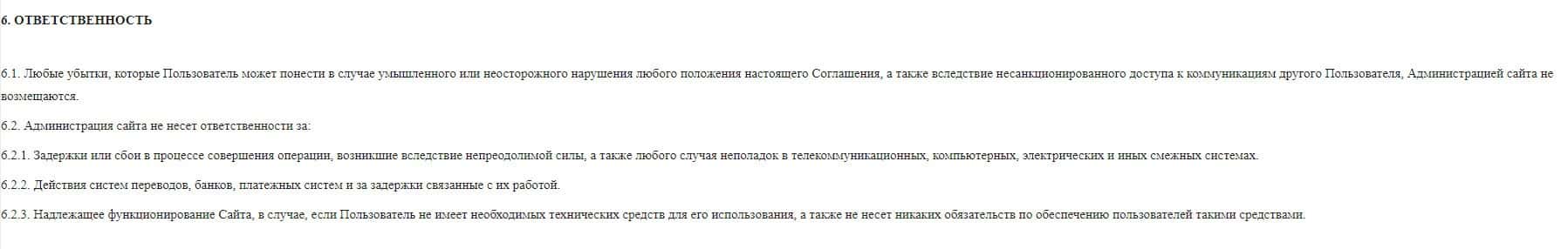 В разделе 6 администрация сайта уведомляет пользователя, что за все потери или ущерб, полученный на сайте, несет ответственность только клиент.