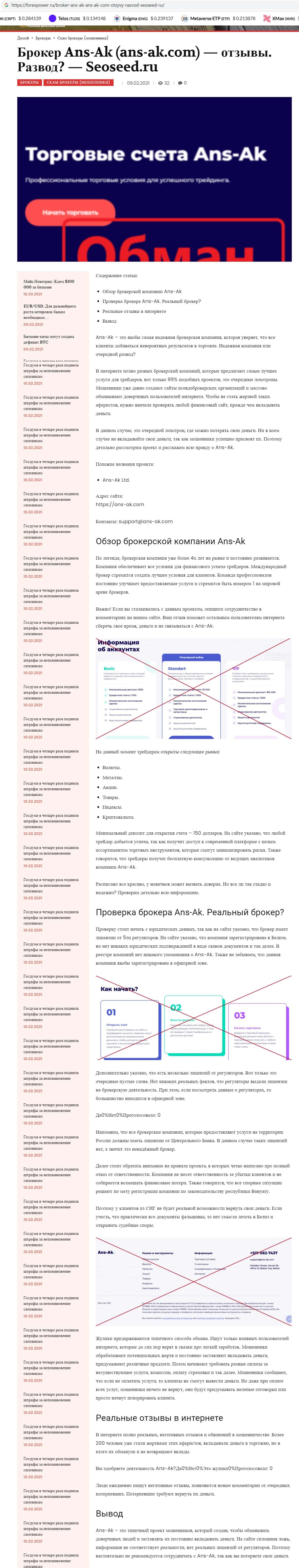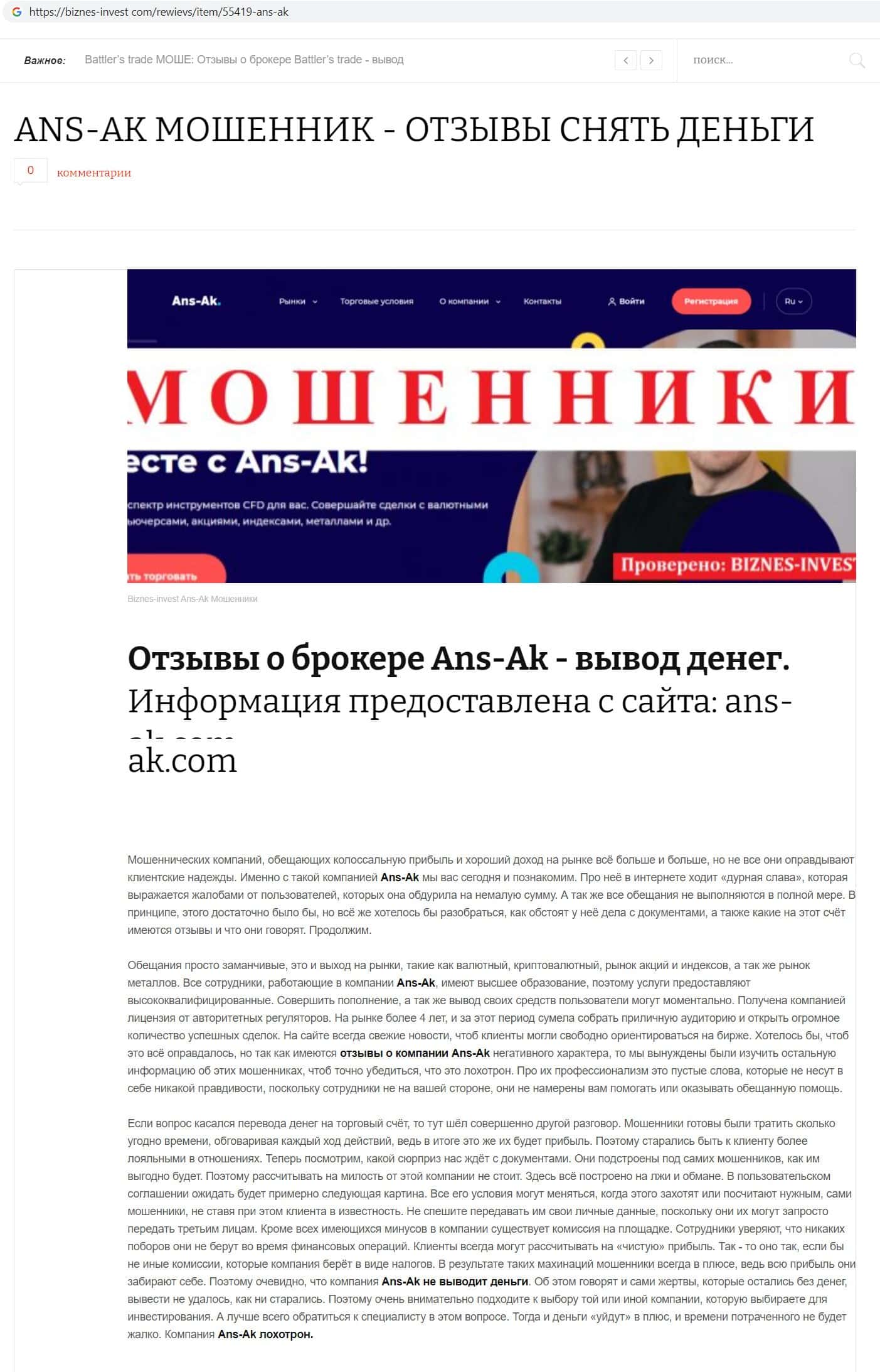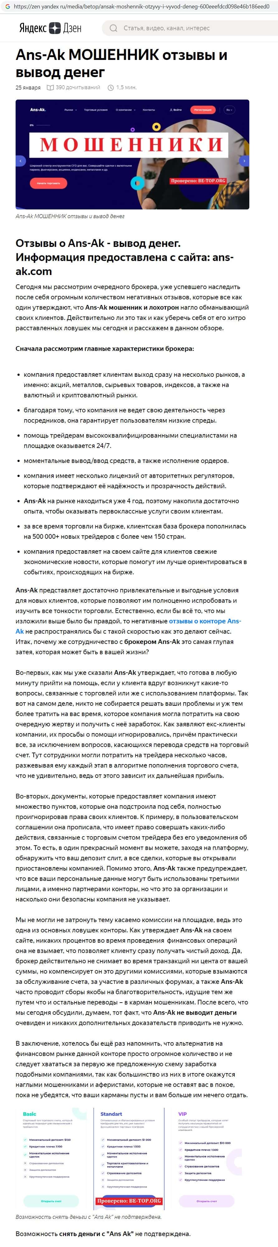 Так же статью о конторе кидал Ans Ak опубликовал и сайт zen yandex ru. Сайт указал, что компания жуликов Ans Ak не выводит денежные средства, так как является мошеннической.