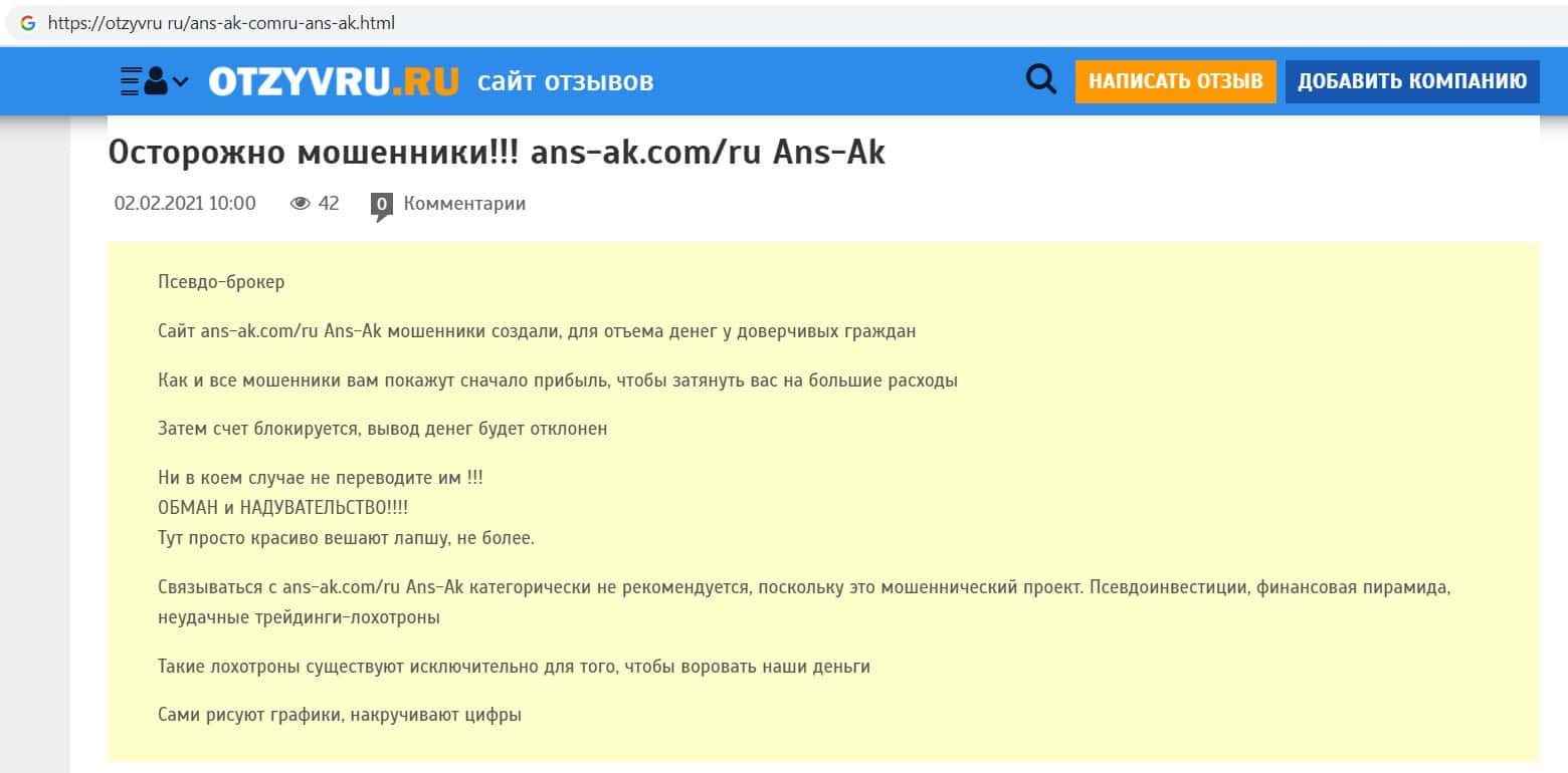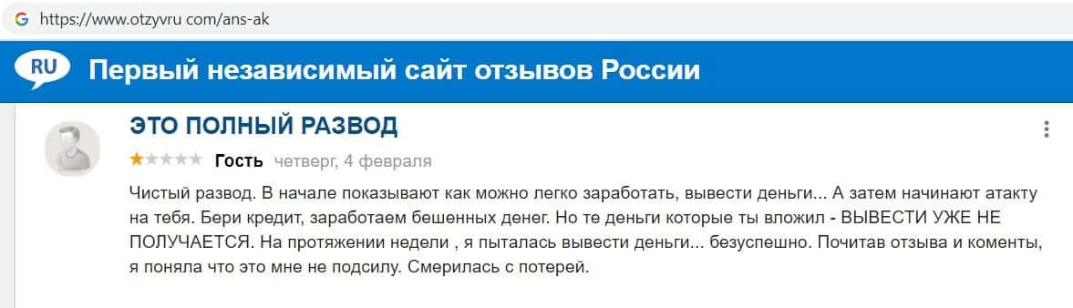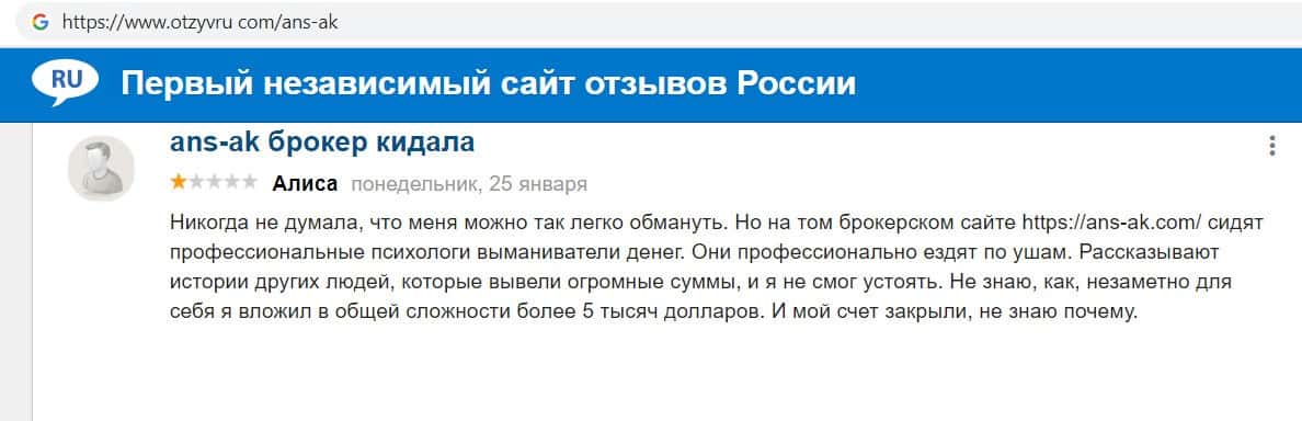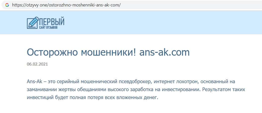 Так же интернет ресурс Otzyvy one указал, что фирма Ans Ak это обычный жулик, который заманивает наивных пользователей в свой лохотрон обещая прибыль, по потом кидает всех.