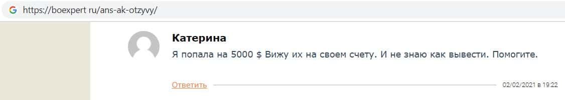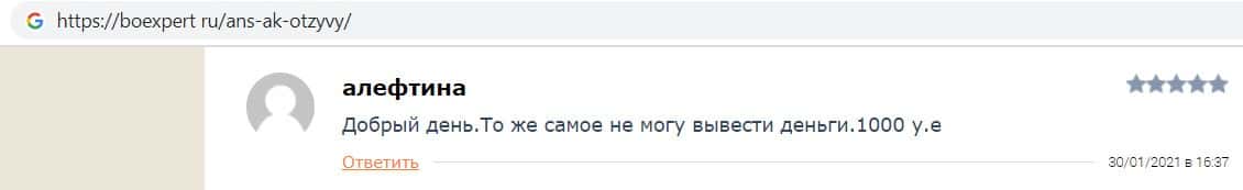 Ещё один пользователь оставил отзыв о фирме кидал Ans Ak. В нём пользователь написал, что не может вывести средства из данного лохотрона, у него на счету 1000 долларов.