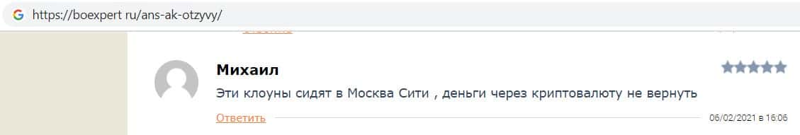 Пользователь написал, что фирма Анс Ак является мошенником, и их временный офис находится в Москве, а денежные средства из конторы вывести совершенно невозможно.