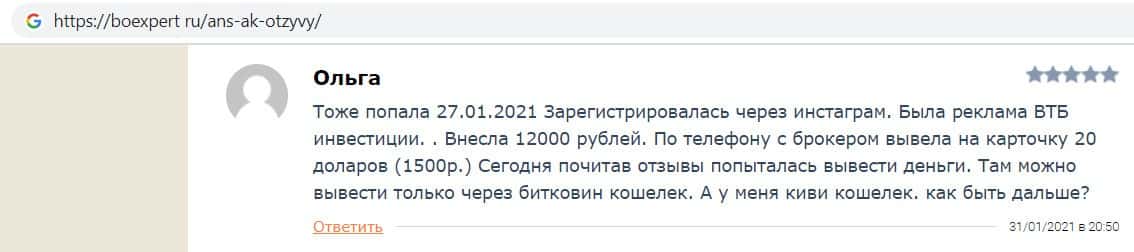 В данном отзыве пользователь написал, что Ans Ak уговорила его инвестировать в свой лохотрон, но теперь клиент не может вывести средства, он понял, что попал в руки мошенников.