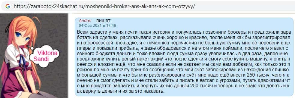 Очередной пользователь написал, что сотрудничал с компанией Ans Ak некоторое время и инвестировал средства, но затем фирма заблокировала счёт и стала требовать 250000 рублей.