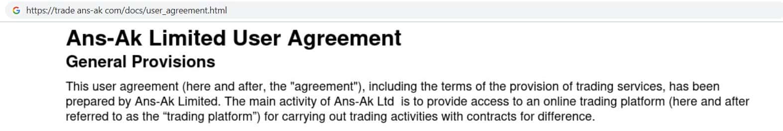 Контора финансовых жуликов Ans Ak предоставила клиентам фальшивое соглашение, так как текст указан только на английском языке, а перевести его или скопировать - невозможно.