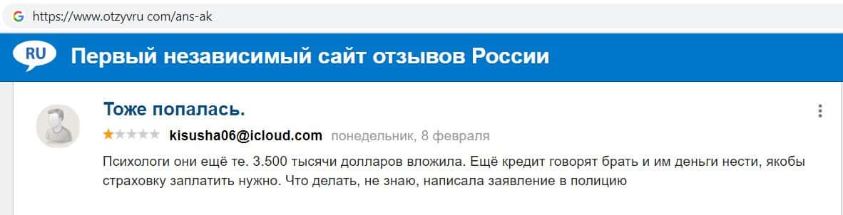 Очередной пользователь написал, что фирма Ans Ak кинула его на 3500 долларов, а так же уговаривала взять кредит. Пользователь решил написать на аферистов заявление в полицию.