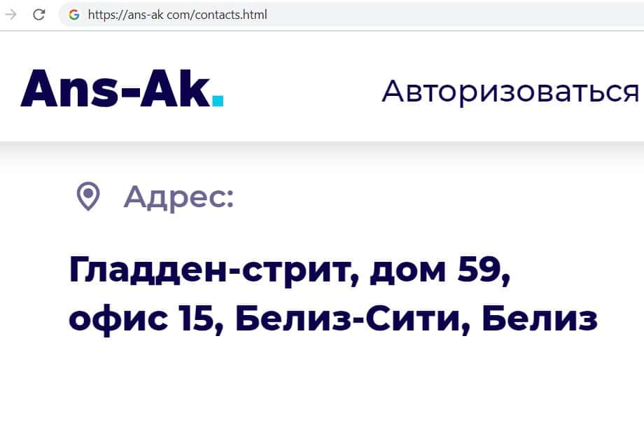 Шарашкина контора Ans Ak на своём сайте указала, что зарегистрирована в Белизе, так как данная зона развязывает руки мошенникам и позволяет разводить своих клиентов.