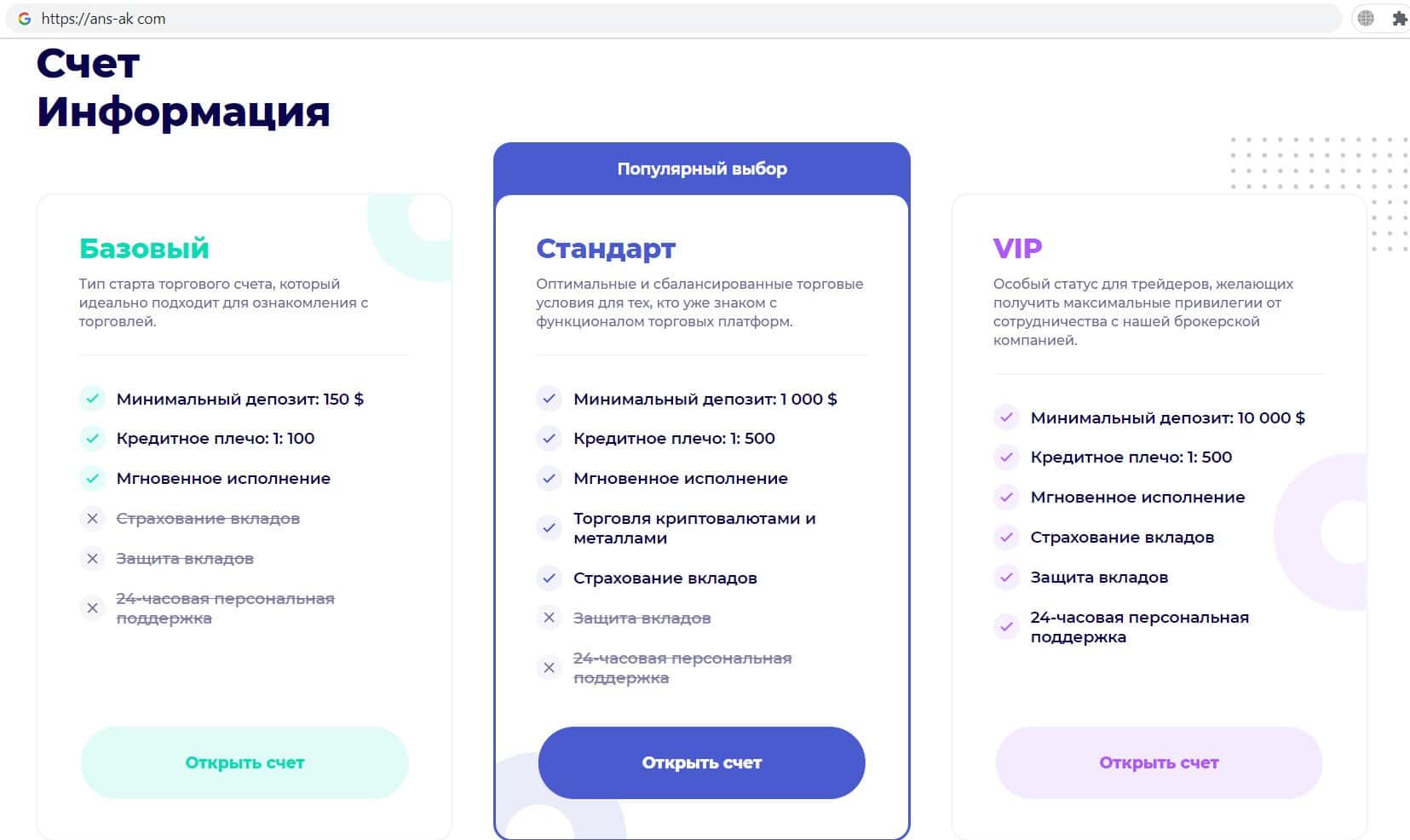 Мошенники Анс Ак на своём сайте представили клиентам счета, которые отличаются бонусами и минимальным депозитом, который варьируется от 150 до 10000 долларов.