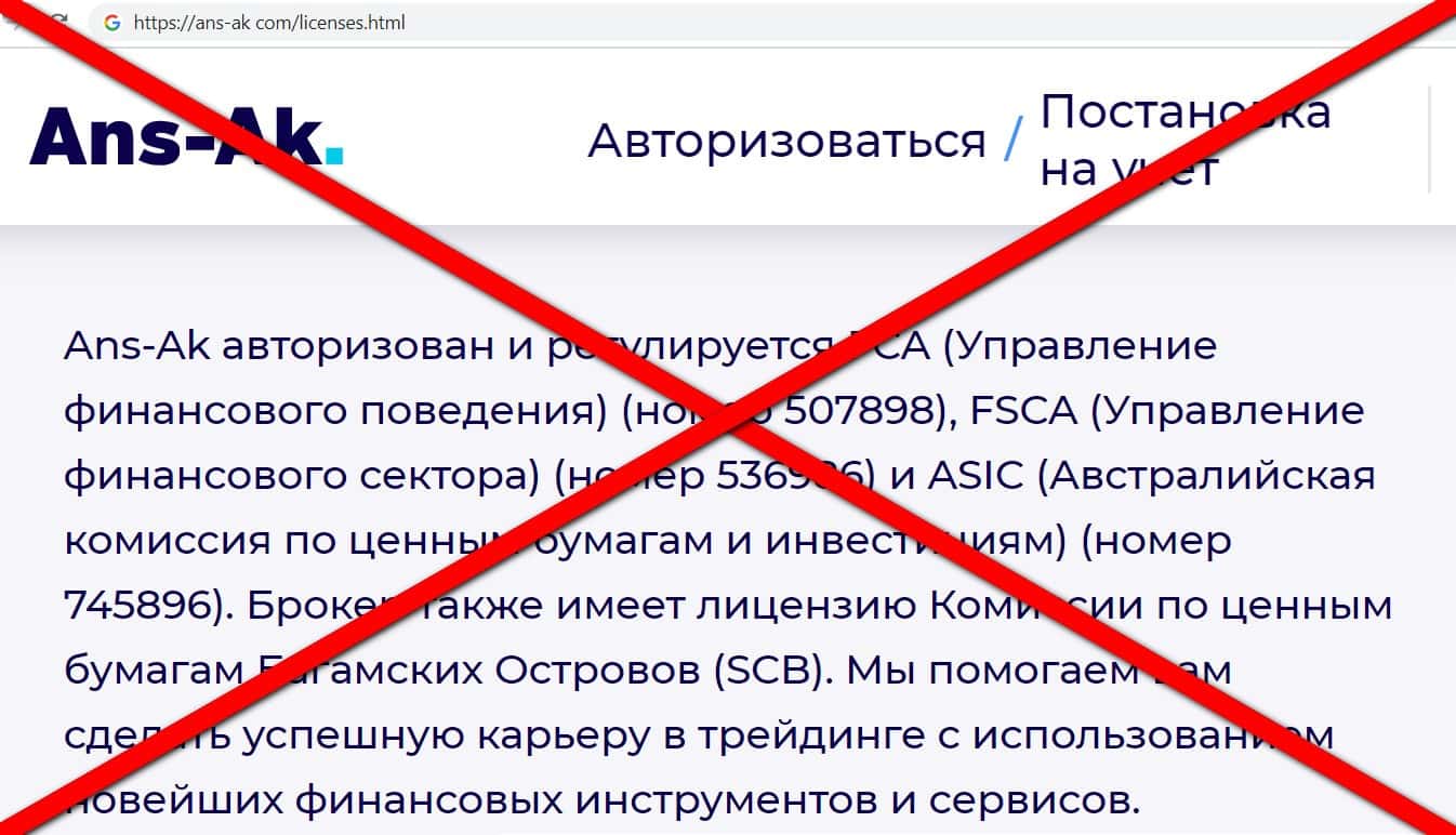 Фирма аферистов Ans Ak указала на своём сайте информацию о своей лицензии, но не предоставила никаких доказательств её наличия, что является очень подозрительным.