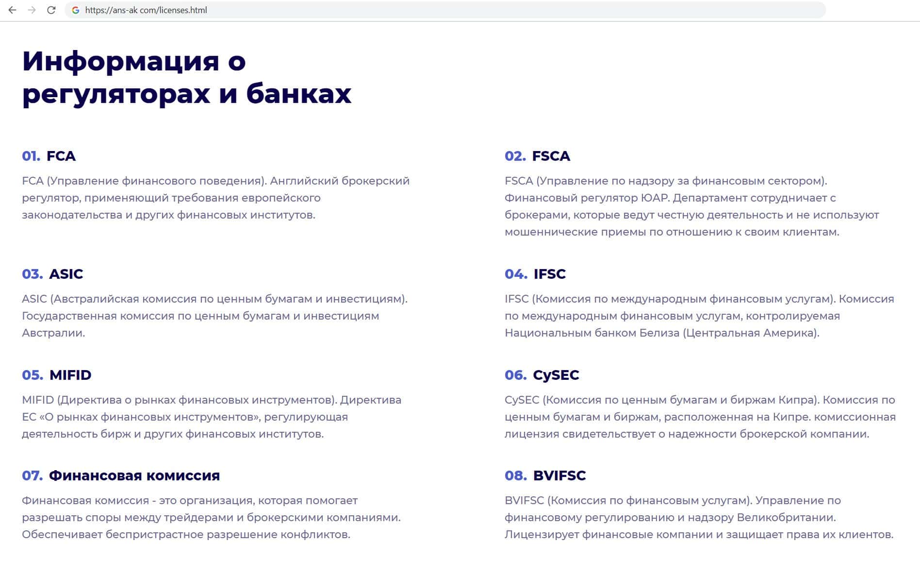 Шарашкина контора Ans Ak указала на своём сайте перечень компаний, которые регулируют лохотрон, среди которых такие мошенники как: ASIC, IFSC, CySEC, FCA.