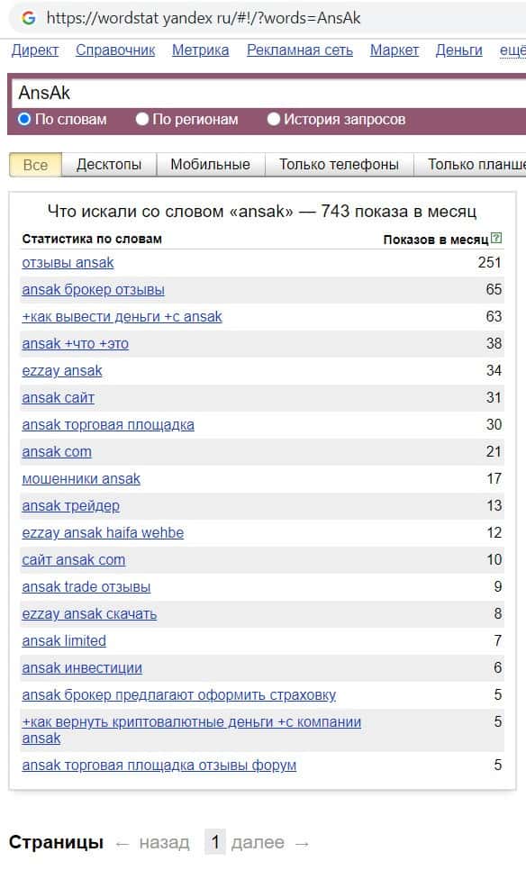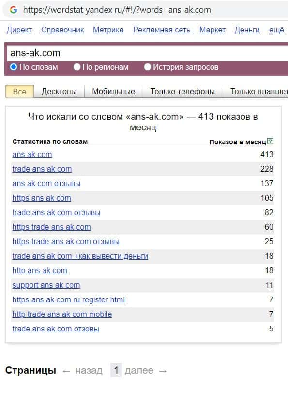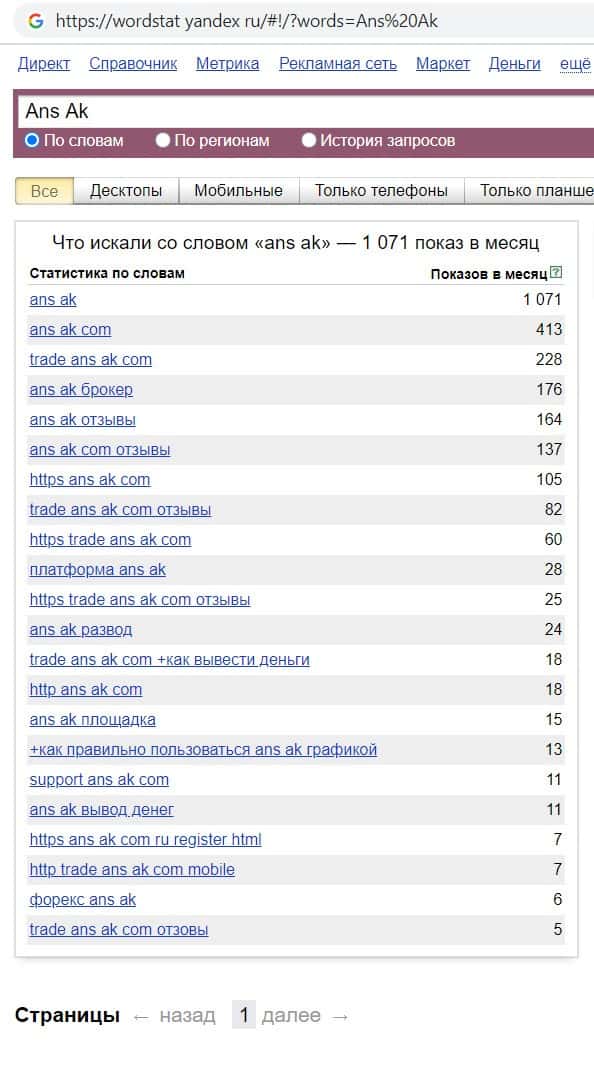 Мы проверили количество запросов компании мошенников Ans Ak в Яндексе по названию фирмы, а именно "Ans Ak". 1071 раз пользователи совершили данный запрос в течении месяца.