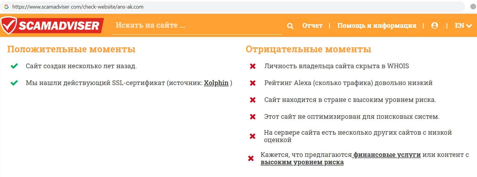 Мнение интернет ресурса scamadviser com о сайте мошенников Анс Ак