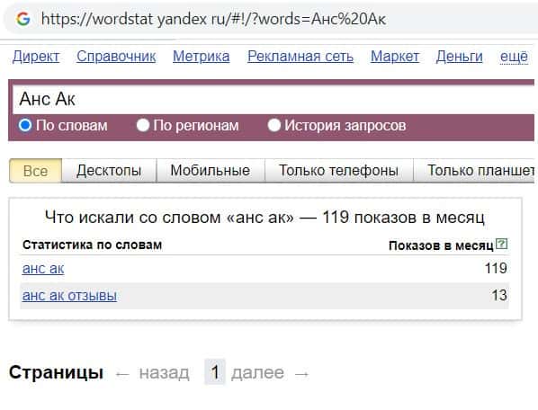 Далее мы проверили количество запросов фирмы аферистов Ans Ak по русскоязычному названию конторы, а именно "Анс Ак". Этот запрос пользователи выполнили 119 раз.